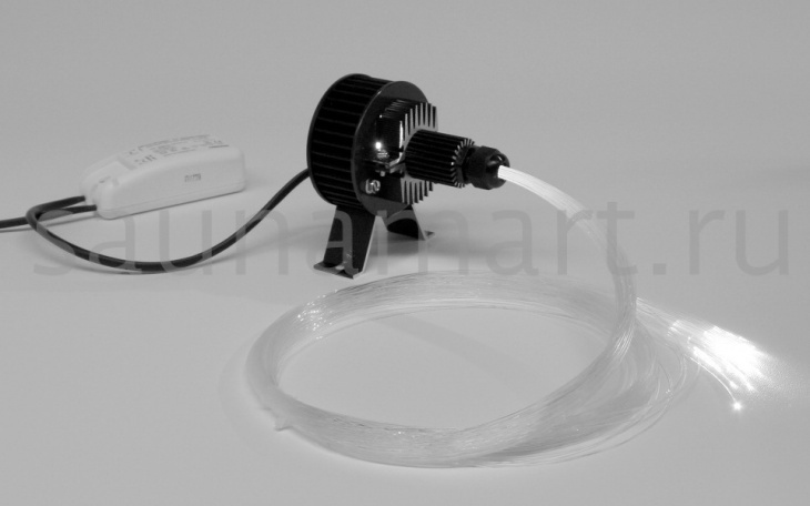 Комплект отлично подходит для создания звездного неба среднего размера. Площадь звездного неба - ок. 2-3 м?. Волокна - пластмассовые, выдерживают температуру 80 °C. Волокна не допускается устанавливать в сауне. Подходят для турецких и инфракрасных бань с температурой ниже 80 °C. Источник света - светодиод теплого света 15,6 Вт. Полный, готовый к установке, комплект включает проектор и волоконный жгут. Диаметр волокна 0,75 мм. Количество и длина волокон: