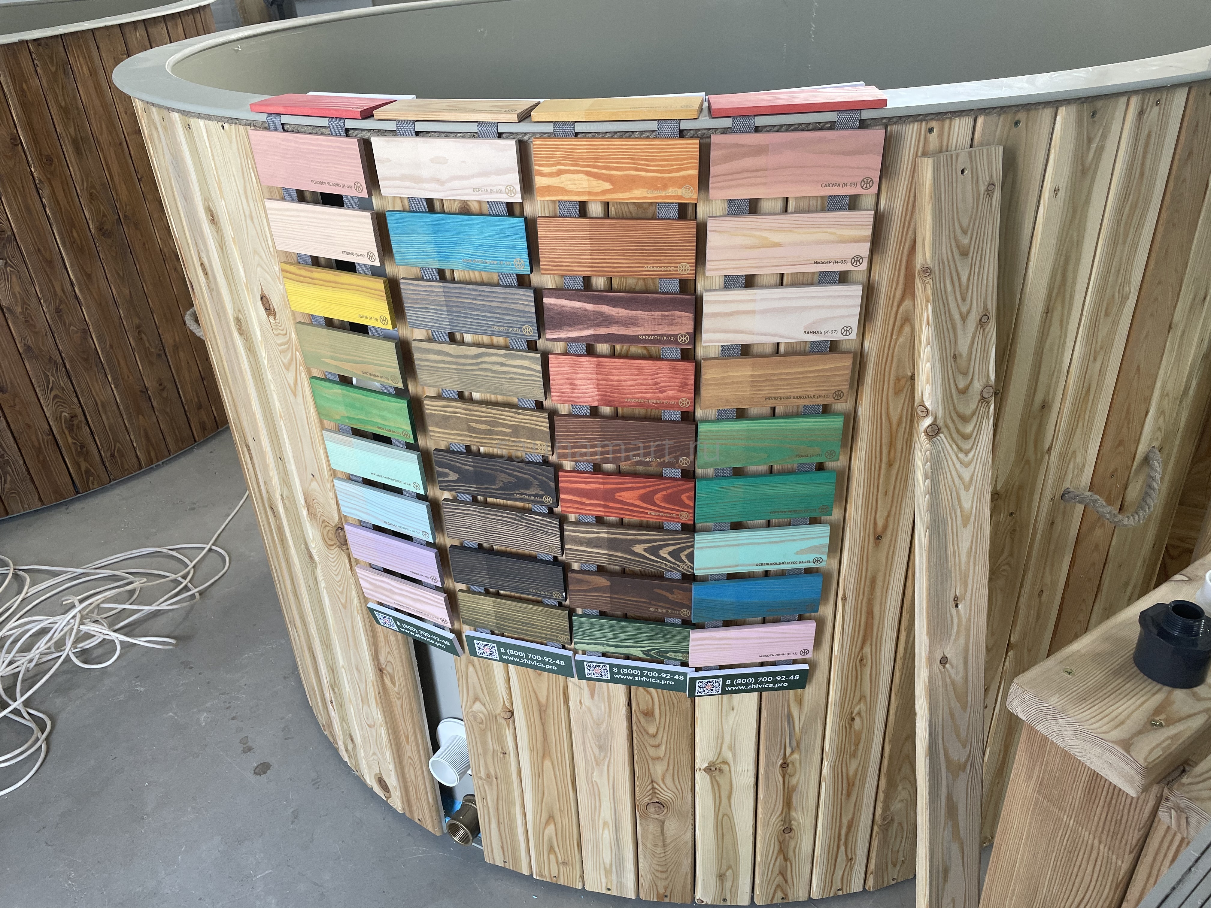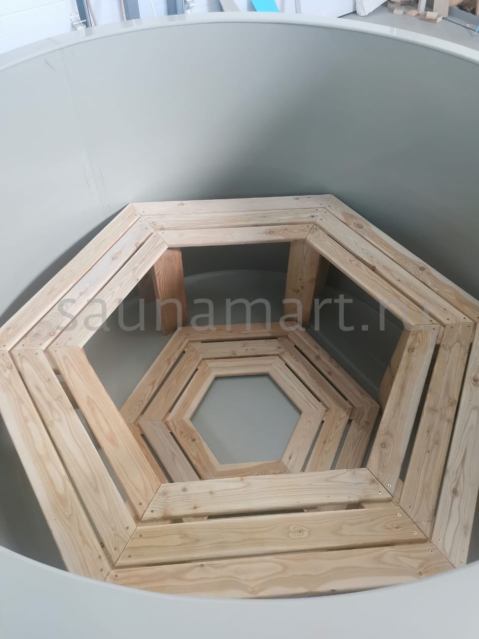Банный чан с комфортом вмещает до 10 человек. Для удобства банный чан оснащен подстаканниками и плавающим столиком.