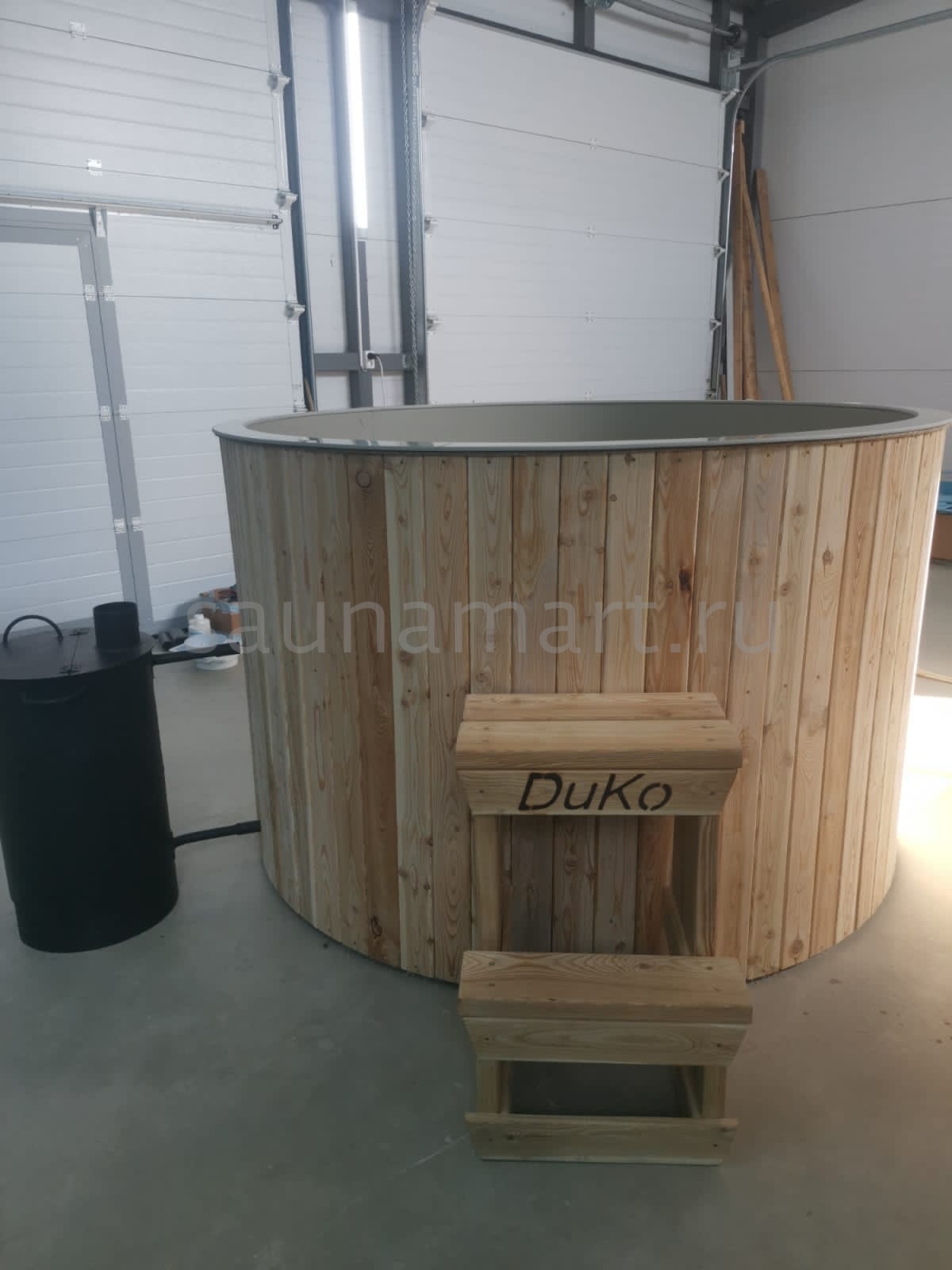 Именно такое парение считается полезным и правильным. Печь установлена под чаном. Так горячая вода поступает снизу вверх.