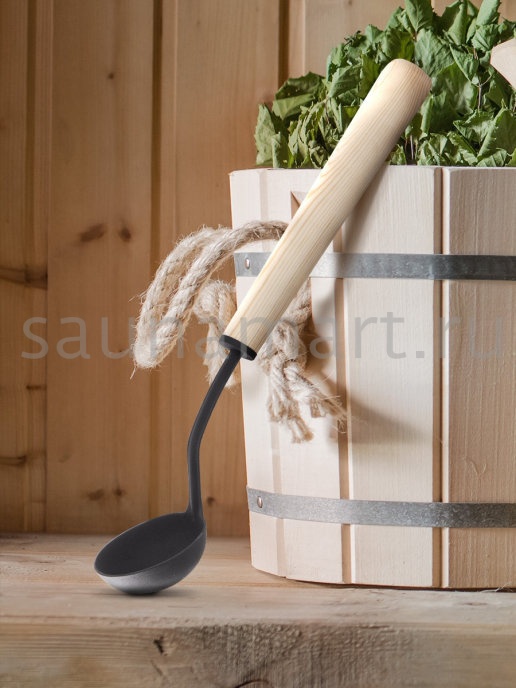 Практичный и долговечный металлический ковш (черпак) с ручкой из натуральной древесины для бани и сауны, обладающей низкой теплопроводностью, которая надежно оберегает ваши руки от ожогов.
