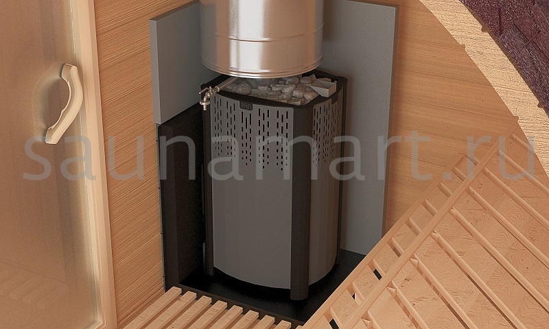 Классический пар. Корзина открытой каменки вмещает большой объём мощно нагреваемых камней и позволяет получать классический пар для получения микроклимата русской бани. Камни расположенные во встроенной в коллектор каменке, нагреваются мощнее.