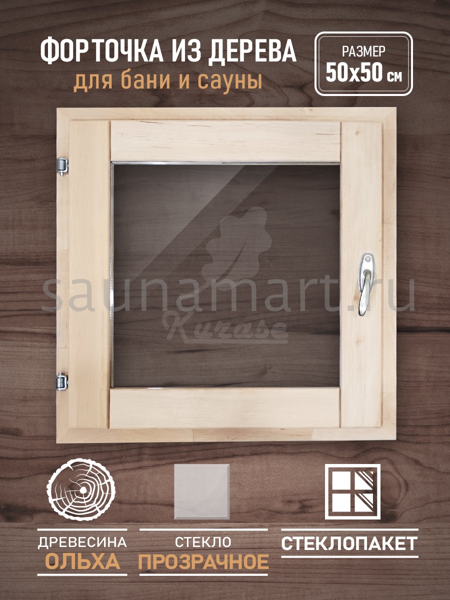 Окно для бани из ольхи  50х50 см. Однокамерный стеклопакет. Окошко из прозрачного стекла. Деревянная рама с фурнитурой в комплекте: петли, ручка и затвор. Форточка для бани из клееной древесины: цельные бруски дерева, срощенные между собой. Это позволяет сделать изделие более долговечным прочным, устойчивым к перепадам температуры и влажности. Банное остекление готово к установке нужно только прикрутить ручку. Маленькое окно в парилку снижает теплопотери, обеспечивает проветривание, вентиляцию и поступление дневного света. Деревянное окно необходимый атрибут в русской бане, как дополнение к системе воздухообмена. Одновременное открытие банной двери и окна образует сквозняк, позволяющий обеспечить тщательное проветривание, для сохранности и долговечности внутренней отделки стен, пола, потолка, печи и полок в бане. Оконная рама не выделяет смол, прекрасно переносит условия высокой влажности и температуры, демонстрируя: влагоустойчивость, устойчивость к гниению и образованию грибка. Деревянная форточка может быть использована для строительства и ремонта гаража, дачного туалета и душевой, дачного домика. Это полезный и нужный подарок для родителей, мамы, папы, бабушки, дедушки, друзей на день рождения, новый год, рождество, 23 февраля и 8 марта.
