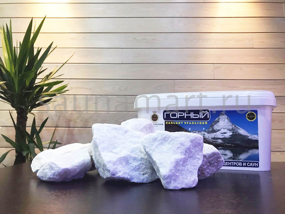 Камень для бани «ГОРНЫЙ Кальцит Уральский» - это камень-наполнитель, представляющий собой произведенную по оригинальной технологии, обработанную, фракционированную и особым образом смешанную продукцию из натуральных горных пород для печей открытого горения, электропечей, газовых печей, парогенераторов. Используется в банях, саунах, турецких банях (хамам).