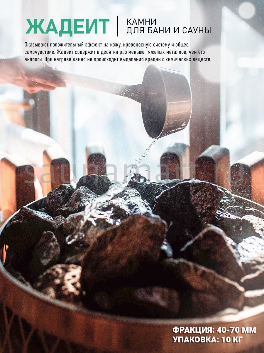 Благодаря своей плотной структуре, жадеитовые камни отличаются длительным сроком службы. Колотые камни прекрасно подходят для заполнения резервуара печи в сауне. Шероховатая поверхность камней гарантирует более активное парообразование.