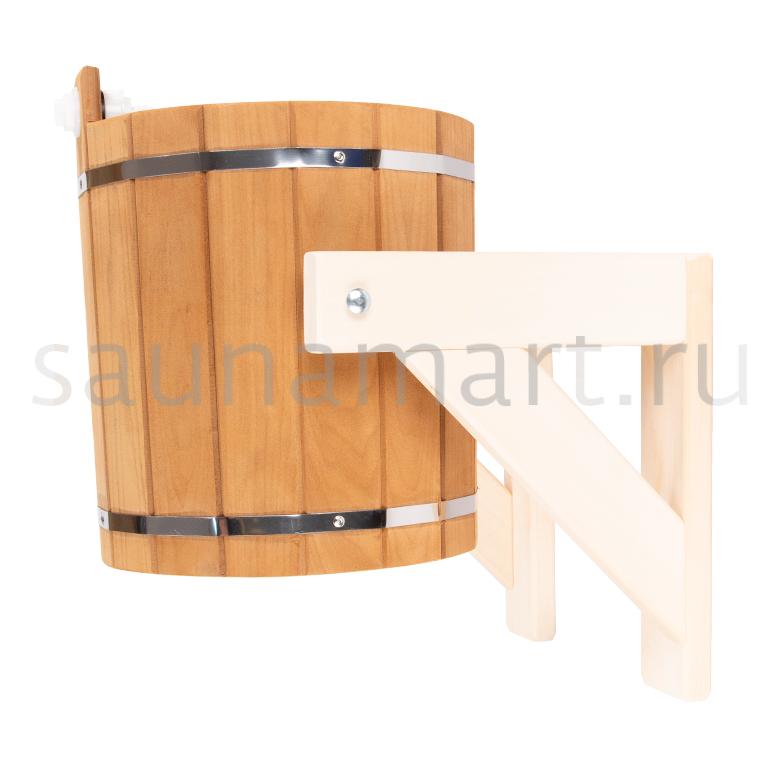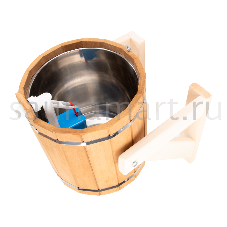 Ведро-водопад является ярким подтверждением известной истины, что все гениальное – просто. Данное бондарное изделие снабжено простыми и надежными элементами залива воды – поплавком и шлангом.