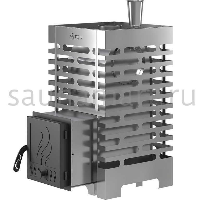 Стеклянная или глухая дверки помогают обслуживать топку и регулировать скорость горения топлива в печи. Линейка печей ASTON из нержавеющей стали рассчитана на установку в парные объёмом от 6 до 22 м?.