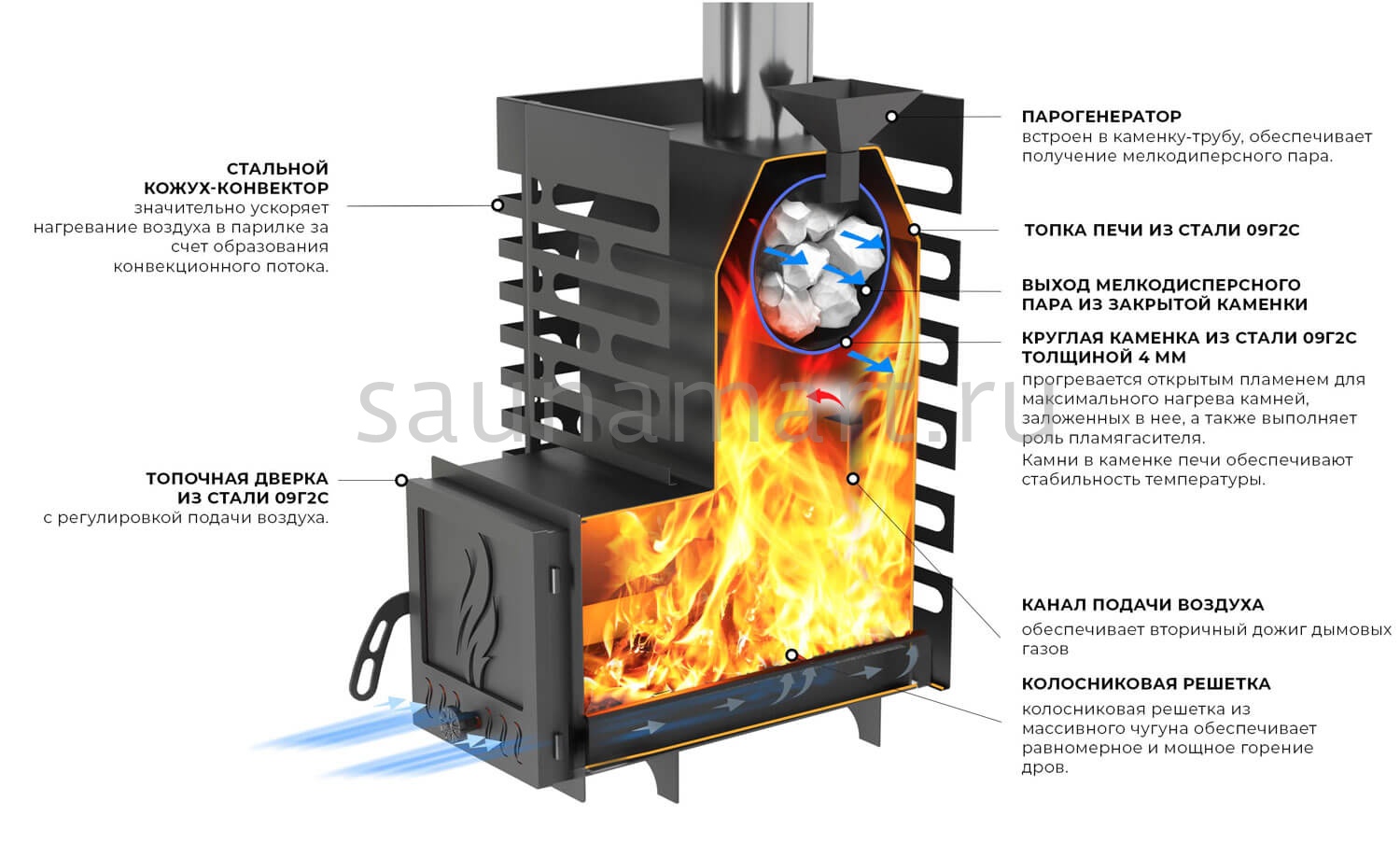 - Материал закрытой каменки: особо прочная котловая сталь 09Г2С