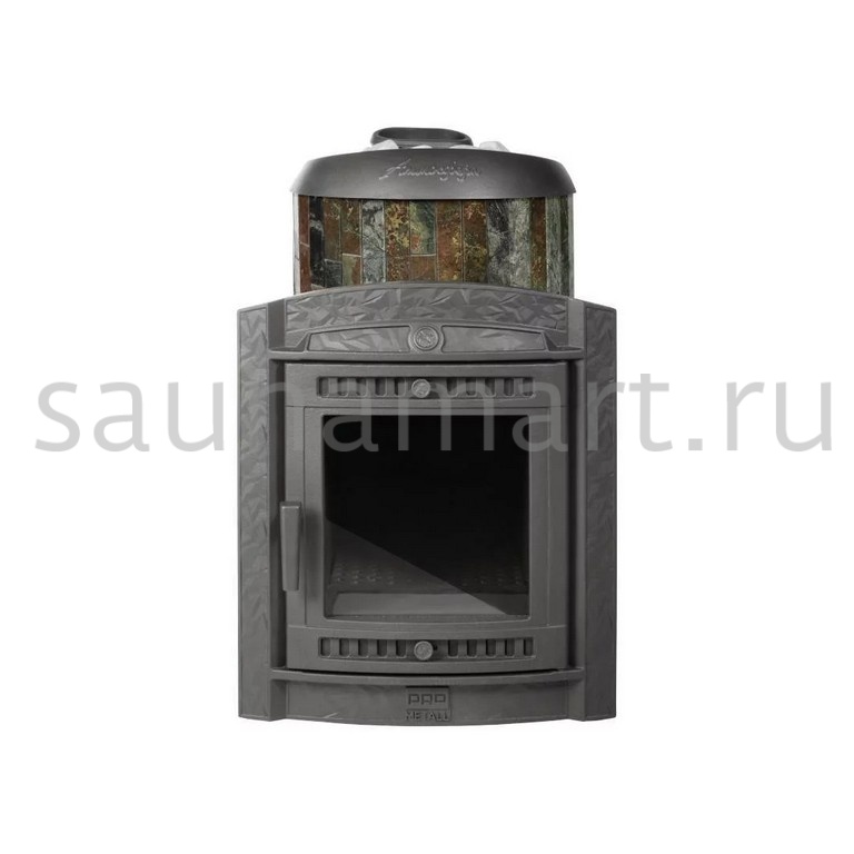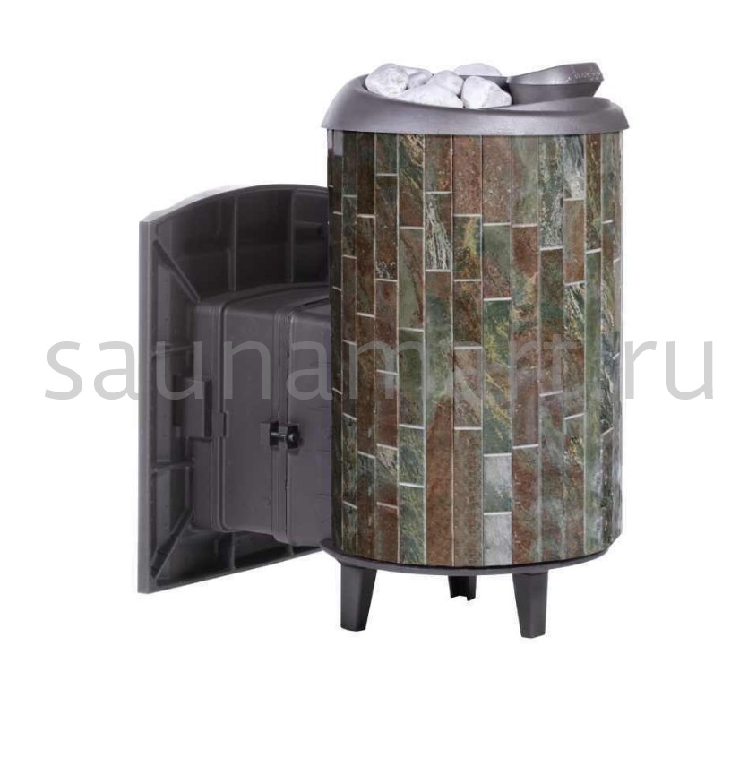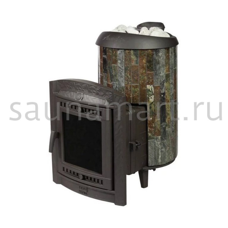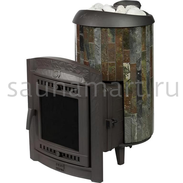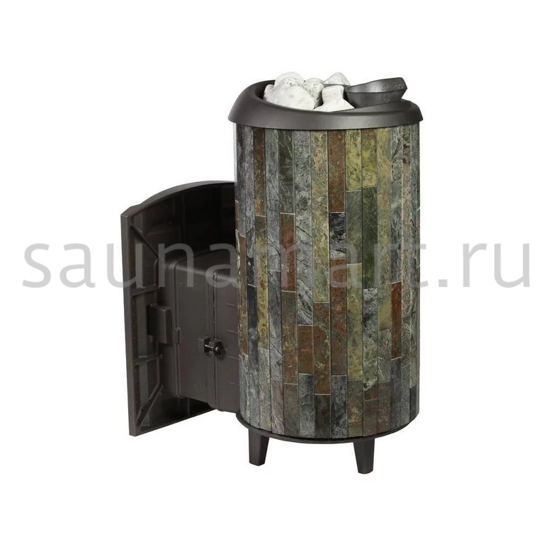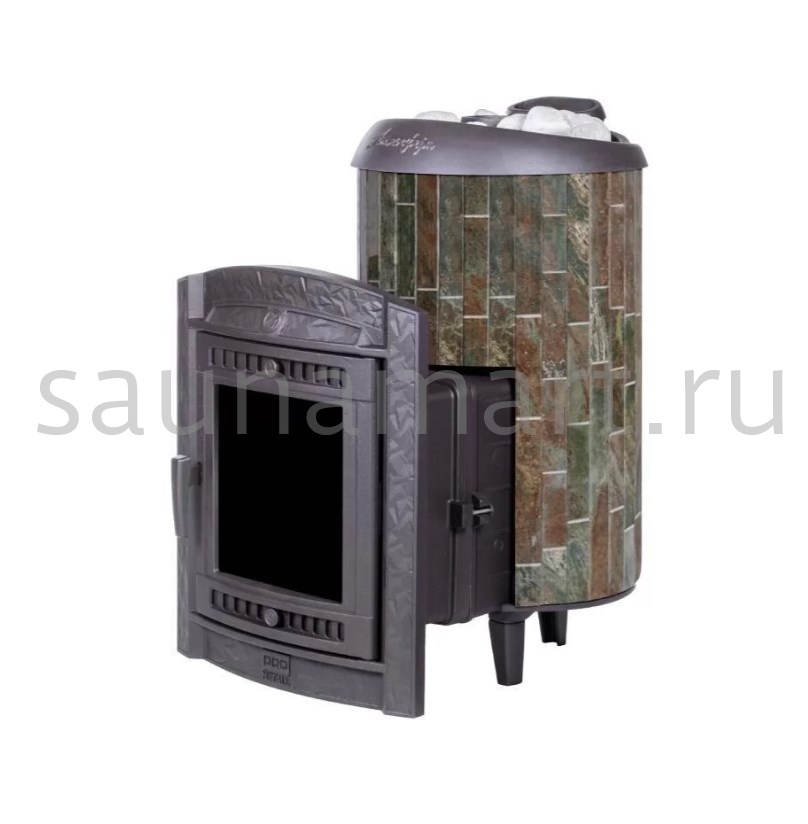 Практичная и компактная модель. Ламели из змеевика по периметру внешней каменки не только обладают хорошими теплонакопительными свойствами, но и придают печи оригинальный внешний вид.