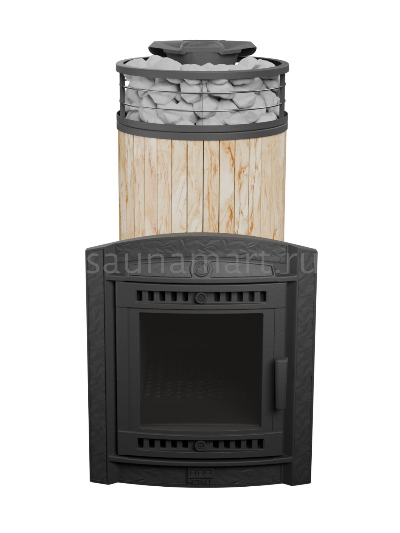 Модель с увеличенной каменкой и повышенной производительностью. Ламели по периметру внешней каменки не только обладают хорошими теплонакопительными свойствами, но и придают печи оригинальный внешний вид