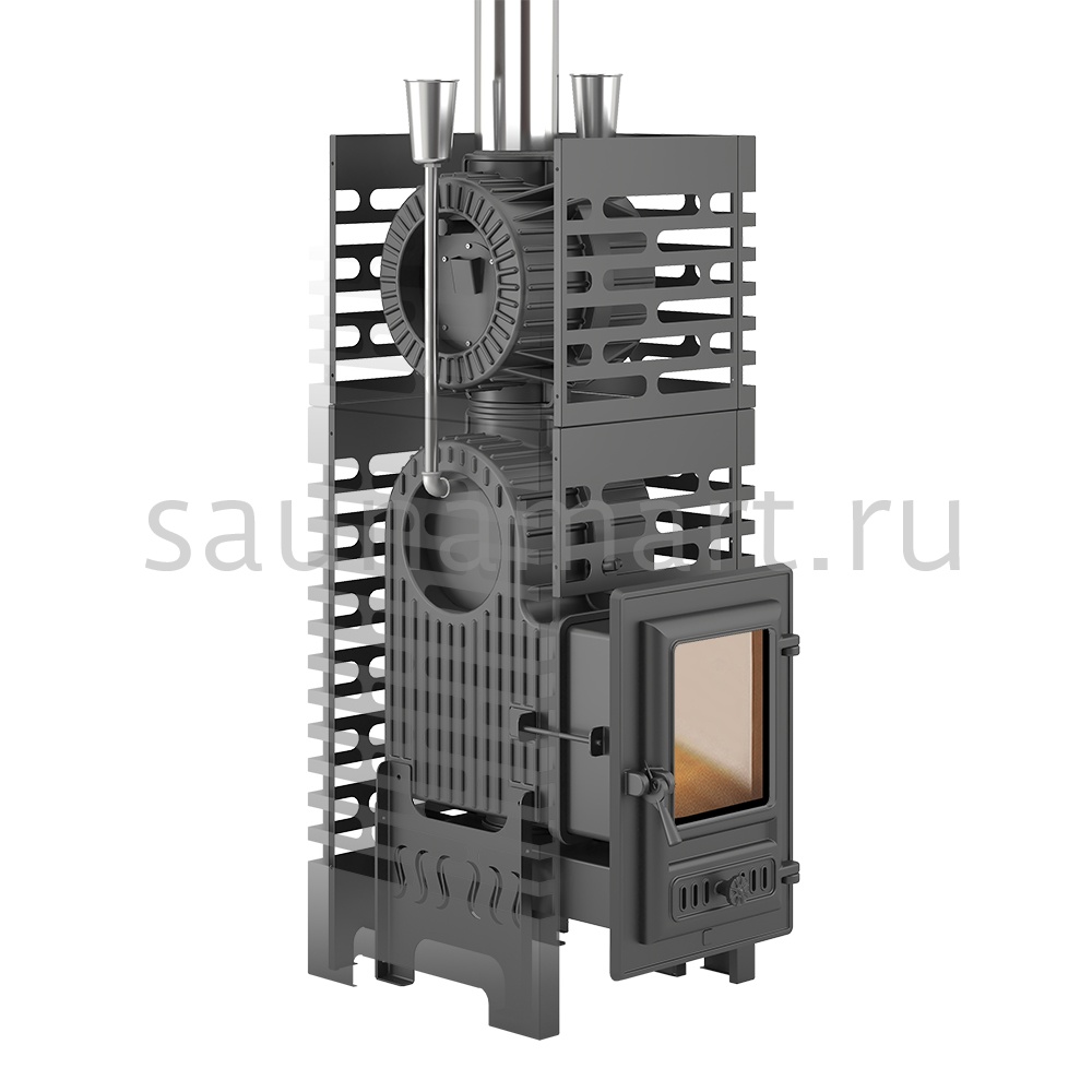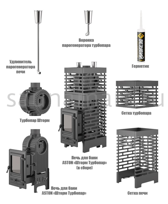Комплект состоит из чугунной банной печи Астон Шторм 18 и чугунной натрубной каменки Турбопар. Объединение двух конструкций в единую систему заметно увеличивает тепловую отдачу термоагрегата, предотвращает перегрев дымохода, организует дополнительную каменку для получения качественного пара.