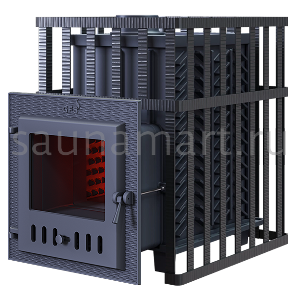 GFS-ЗК в сетке 18(М) — это печь с усиленной каменкой большей массы, с единым углублением внутрь топки для дополнительной укладки чугунного заряда. Теплосъемные шипы, со стороны горения пламени, в разы увеличивают площадь соприкосновения огня с каменкой и ускоряют передачу тепла, а также способствуют лучшему дожигу, смешивая потоки пламени и воздуха, поступающего из воздушника. Эти усовершенствования значительно повышают мощность парообразования печи и выдают большее количество пара при непрерывной подаче воды. Каменка печей GFS-ЗК является незаливаемой.