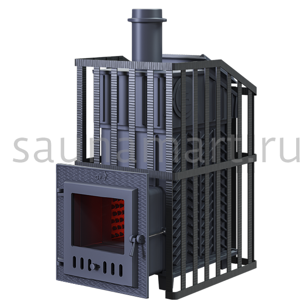 Гефест ЗК в сетке 30(М) Ураган представляет собой расширенный комплект печи Гефест ЗК в сетке. Это максимально приближенный вариант печи для режимов русской парной, имеющий закрытую каменку, защищенную чугунным коробом, дверцу для пара с ручкой из бука и увеличенную до 50 см чугунную стартовую трубу. Печь легко модернизируется до полноценной печи, предназначенной для русской бани, путем замены стальной сетки на каменную облицовку без демонтажа дымохода.