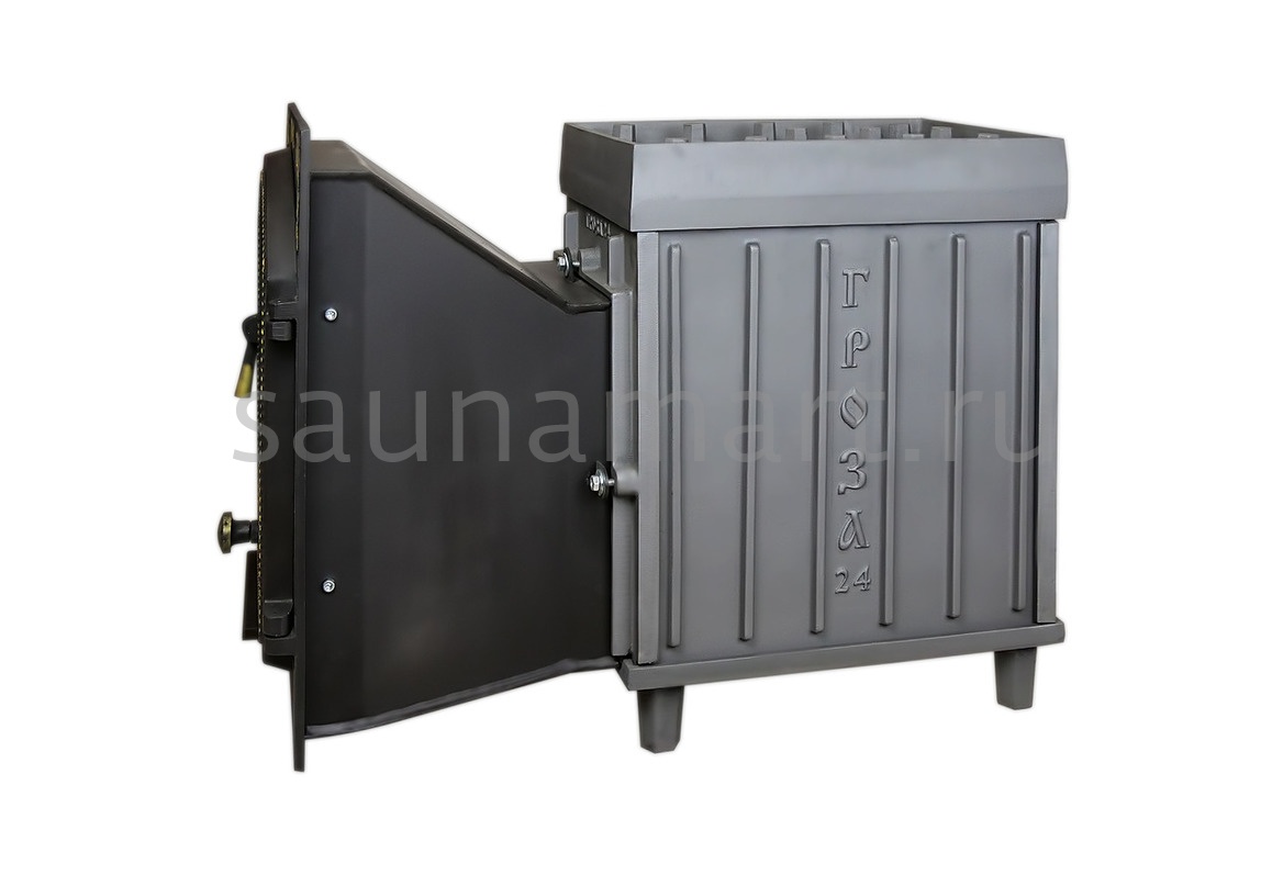 Печь для бани Гроза разработана как максимально экономичная модель для частного применения. Основной принцип работы печи сохранён – получение пара с теплоёмкой каменки прямого нагрева. Каменка является сводом топки, нагревается с нижней поверхности, снабженной теплосъемными шипами для увеличения контакта с пламенем.
