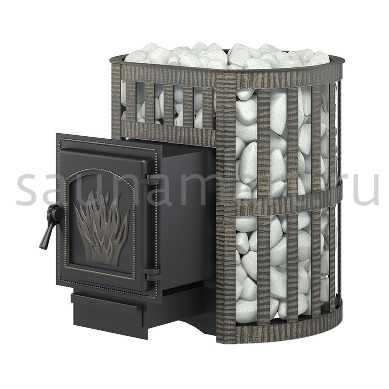Банная чугунная печь Легенда Ковка 16 (271) укомплектована чугунной герметичной дверцей Везувий 271. Конвекционно-вентилируемый кожух "Ковка" изготовлен из металлической текстурированной полосы, покрашенной термостойкой краской и покрытой патиной «Бронза».