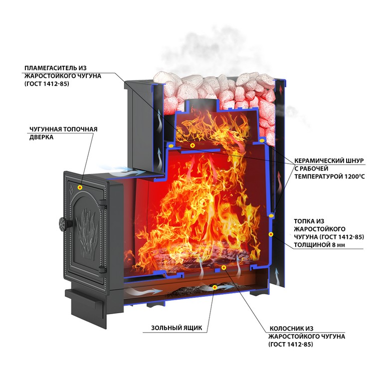 - Материал топки: жаростойкий чугун (ГОСТ 1412-85)