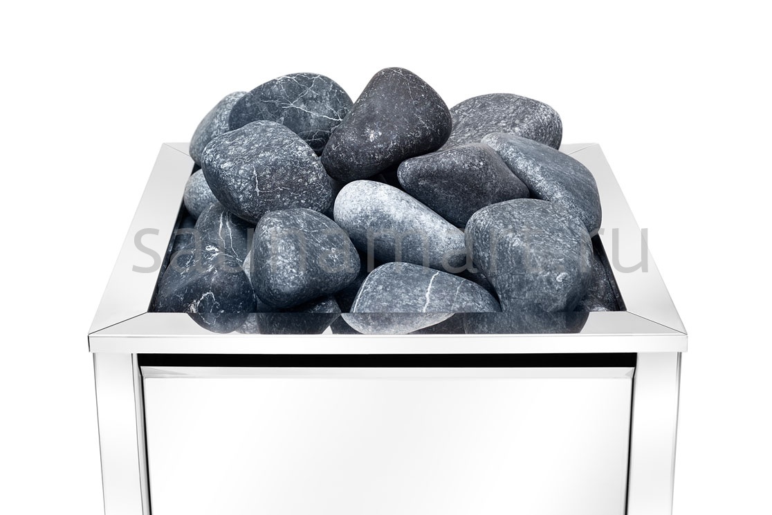 Представленная модель электрокаменки имеет отсек для камней, который вмещает до 25 кг. Она монтируется напольно.