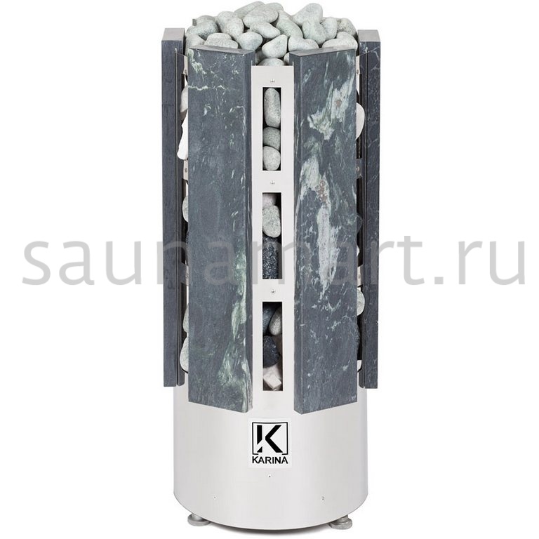 Электрокаменка Karina Forta 12 Талькохлорит предназначена для использования в парных объемом до 16 м?. Печь выполнена в напольном варианте и обладает цилиндрической формой, дополненной плитами из натурального камня Талькохлорита.