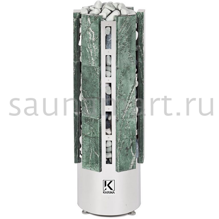 Электрокаменка Karina Forta 15 Змеевик предназначена для использования в парных объемом до 24 м?. Печь выполнена в напольном варианте и обладает цилиндрической формой, дополненной плитами из натурального камня Змеевика.