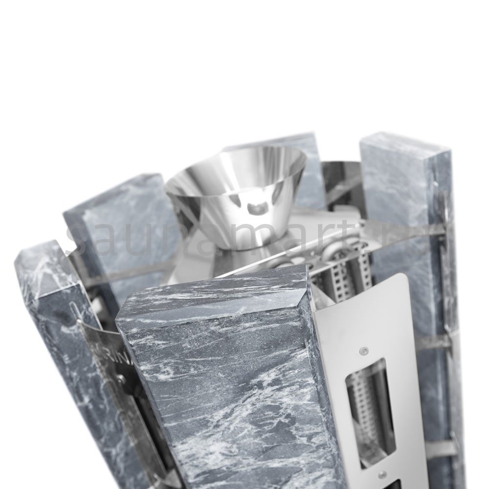 Все корпусные элементы печи выполнены из нержавеющей стали. Нагревательный элемент - ТЭН диаметром 10мм. Наружный кожух каменки дополнительно облицован плитами из Талькохлорита толщиной 40мм, что придает ей еще большую теплоемкость и меньшее излучение от металлических элементов, которые выжигают воздух в парной. Общий вес камней – 205кг (120кг – загрузка камней в печь и 85кг - вес облицовки), что сопоставимо с закладкой камней в хорошую дровяную печь. Тем самым с помощью парогенератора, закрытой каменки и закладки камня в 205 кг, легко достигается режим настоящей русской бани.