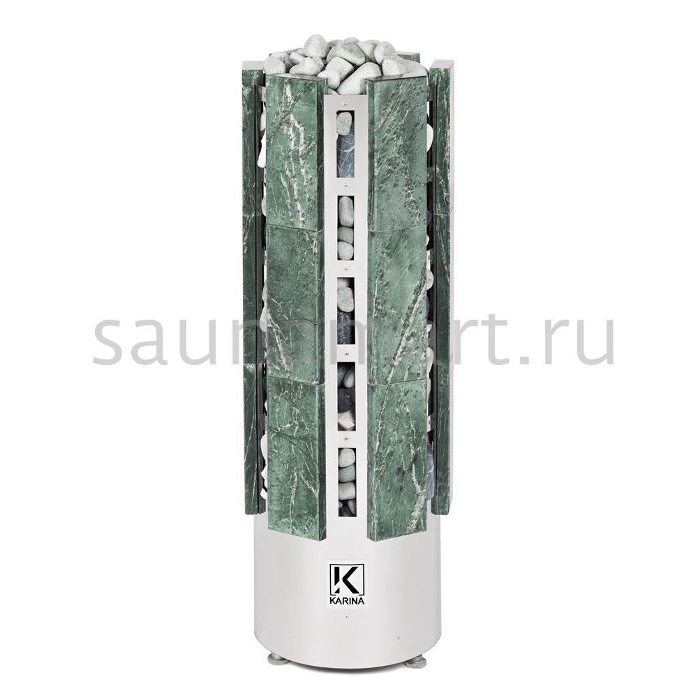 Электрокаменка Karina Forta 21 Змеевик предназначена для использования в парных объемом до 38м3. Печь выполнена в напольном варианте и обладает цилиндрической формой дополненной плитами из натурального камня Змеевика. Напряжение питания - 380В. Данная модель имеет 9 тэнов, расположенных в виде треугольника. В центре внизу расположен бак для воды емкостью 5л, который является парогенератором. Выше парогенератора имеется емкость под мелкие камни или нержавеющие шары объемом 4.7л, вмещающая 10 кг мелкого камня, называемая закрытой каменкой с воронкой для подачи воды и получения мелкодисперсного пара. Электрическая печь Karina Forta 21 Змеевик многофункциональна, и при правильной эксплуатации она подойдет для любителей как финской сауны, так и русской бани.