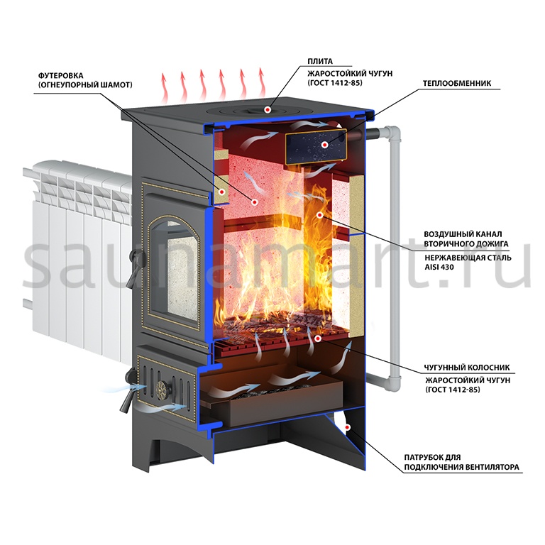 Преимущество Печи-камина ВЕЗУВИЙ ПК-01 (205) с плитой: Камин изготовлен из особо прочной котловой стали марки 09Г2С. Чугунная топочная дверь Везувий 205 с жаростойким стеклом. Чугунная поддувальная дверь с системой регулировки режимов горения. Чугунная колосниковая решётка. Топка футерована легкозаменяемым высококачественным шамотом. Керамические боковые вставки. Мощность 12 кВт (200 м3). Длительность горения одной закладки дров до 5 часов. Чугунная варочная плита. Возможность подключения электрического вентилятора, который обеспечивает «турбореактивный» разогрев помещения.