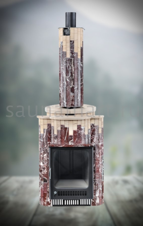Для печи «Оптима» серии ПФ производитель V?hringer выпускает порталы из натурального мрамора, змеевика и жадеита. Облицовочные материалы поступают на завод в слэбах, заготовки разрезают на пластины, которые затем навешивают на печь.