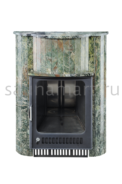Для печи «Оптима» серии ПФ производитель V?hringer выпускает порталы из натурального мрамора, змеевика и жадеита. Облицовочные материалы поступают на завод в слэбах, заготовки разрезают на пластины, которые затем навешивают на печь.