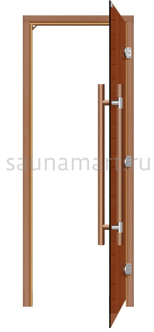 Дверное полотно данной модели сделано из закаленного стекла бронзового оттенка, который приятно гармонирует с дверной коробкой, выполненной из древесины осины. Осина отличается комплексом особенностей, которые делают её хорошим вариантом для парильного помещения. Она не разбухает, не коробится и не трескается в условиях высокой влажности. К тому же осина отличается антибактериальными свойствами. Вертикальная ручка не только позволяет удобно открывать и закрывать дверь, но и выступает в качестве декоративного элемента.