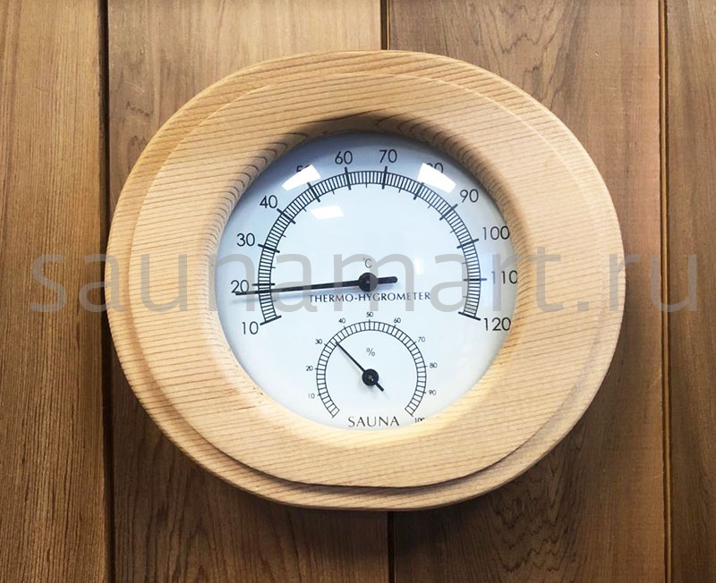 Термогигрометр имеет оригинальную круглую форму. В широкой рамке из древесины кедра  находится циферблат, который сообщит о температуре воздуха. Данный прибор прекрасно подойдёт для использования в парной. Максимально допустимая для измерения температура составляет 120 градусов Цельсия. Этого максимума достаточно для комфортных банных процедур. Нагнетание в парном помещении большей температуры нежелательно, так как может быть опасным для здоровья. Благодаря универсальному дизайну термометр станет прекрасным дополнением любого интерьера.