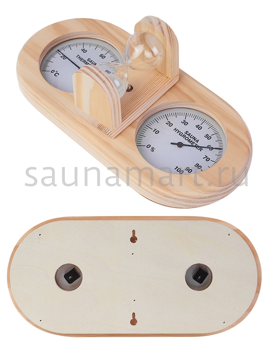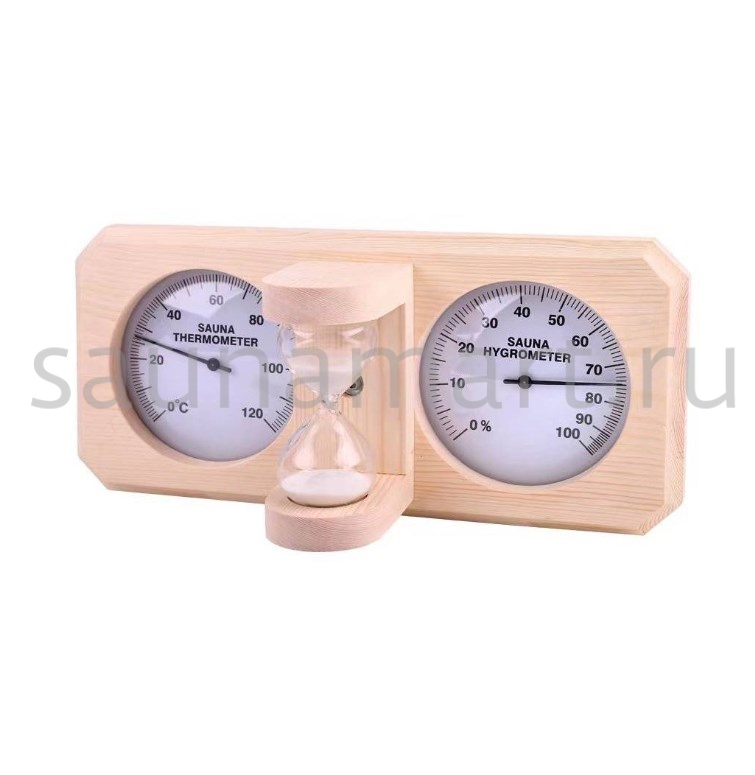 Термогигрометр со встроенными песочными часами 3 в 1 это товары для бани и сауны,  - универсальные аксессуары для обустройства бани, которые создают уют, комфорт, удобство и особенную атмосферу в парилке русской бани. В широкой раме из дерева находятся два круглых циферблата под термостойким стеклом: термометр и гигрометр. Градуировка шкалы гигрометра варьируется в пределах от 0 до 100 %. Градуировка шкалы термометра варьируется в пределах от 0 до 120 градусов по Цельсию. Предусмотрена возможность калибровки измерительного прибора. Между циферблатами располагаются песочные часы для бани, рассчитанные на 15 минут. Это идеальное время нахождения в парилке. Банный аксессуар не боится высокой влажности и температуры, поэтому идеально подходит для использования в любом парильном помещении, как в условиях русской бани, финской сауны так и хамама. Предназначен для настенного размещения. Помните, чтобы проведённое в парной время оказало благоприятный эффект на здоровье и самочувствие, необходимо тщательно соблюдать температурный режим парения, режим влажности и длительности пребывания в парной. Не подвергайте прибор ударам и падению. Упаковано в картонную коробку. Все банные принадлежности нужно выбирать тщательным образом. Представленный банный аксессуар изготовлен из экологичного сырья и прошел все этапы сушки и обработки. Банная метеостанция станет прекрасным подарком для банщиков, отца, мамы, дедушки, мужа, сына, внука, друга, брата, которые любят русскую баню. Эта стильное интерьерное решение подойдет еще и для ванной комнаты и балкона.